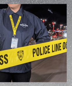 This sturdy, bright yellow lanyard printed on both sides with “CRIME SCENE DO NOT CROSS” in black letters.