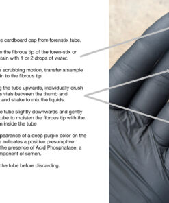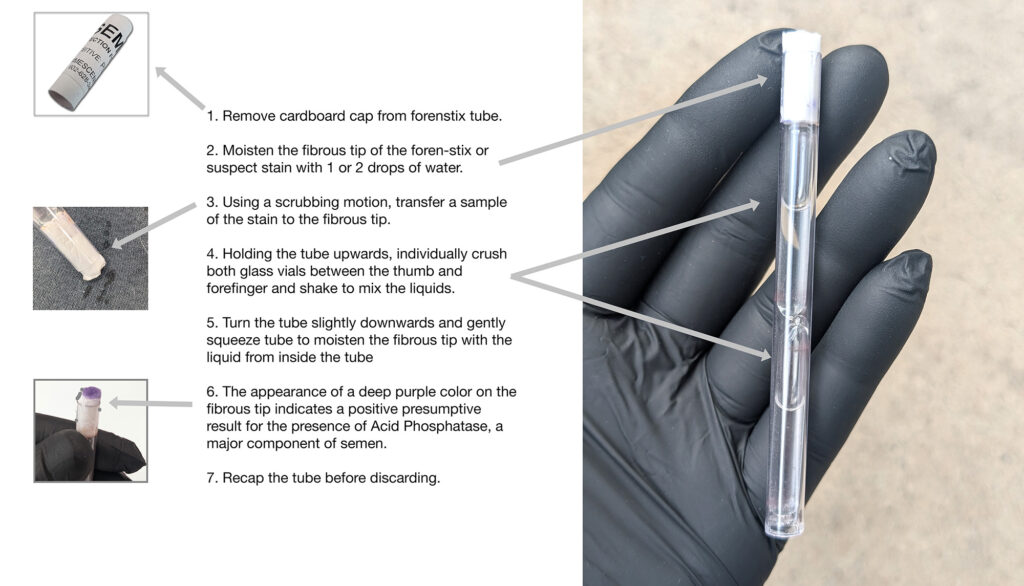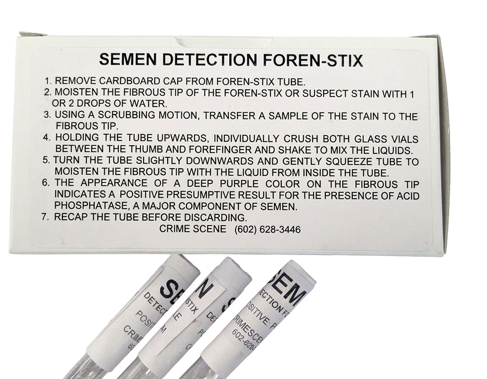 This is a test for acid phosphatase in semen. Each vial provides a single use test that is mixed upon use. The forenstix tube has two chemicals in vials that are crushed in the vial and mixed in the same via upon use. The reagent is fresh and potent. A positive result is bright purple in 15 seconds.