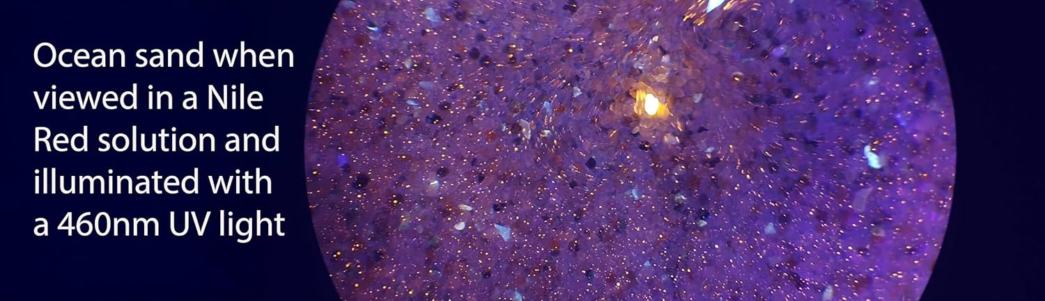 Nile Red has found a new use in microplastic research. When samples from the environment are stained using Nile Red, the plastic in the samples is then fluorescent when irradiated with 460nm blue light.