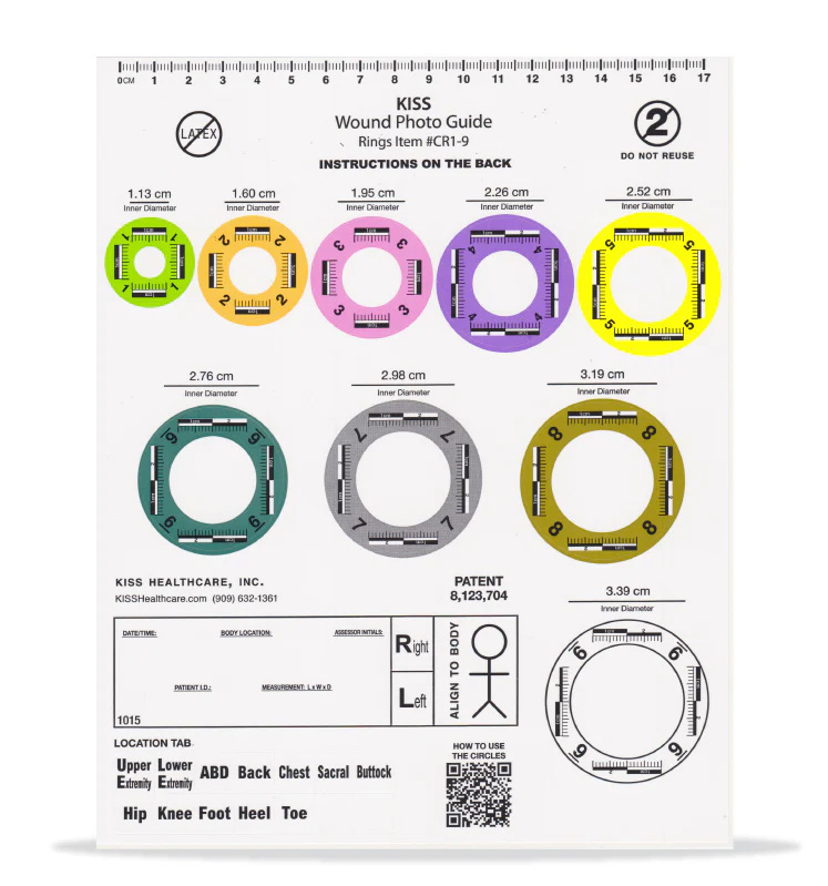 The wound Photo ScalesĀ ring scale offer rings in sizes 1 to 9 sq. cm, each equipped with 4 linear scales for accurate length and width measurements.Ā Wound Ring Scales come with note labels, alignment stick figures, and body location tabs, and includes two blank tabs for custom body locations.