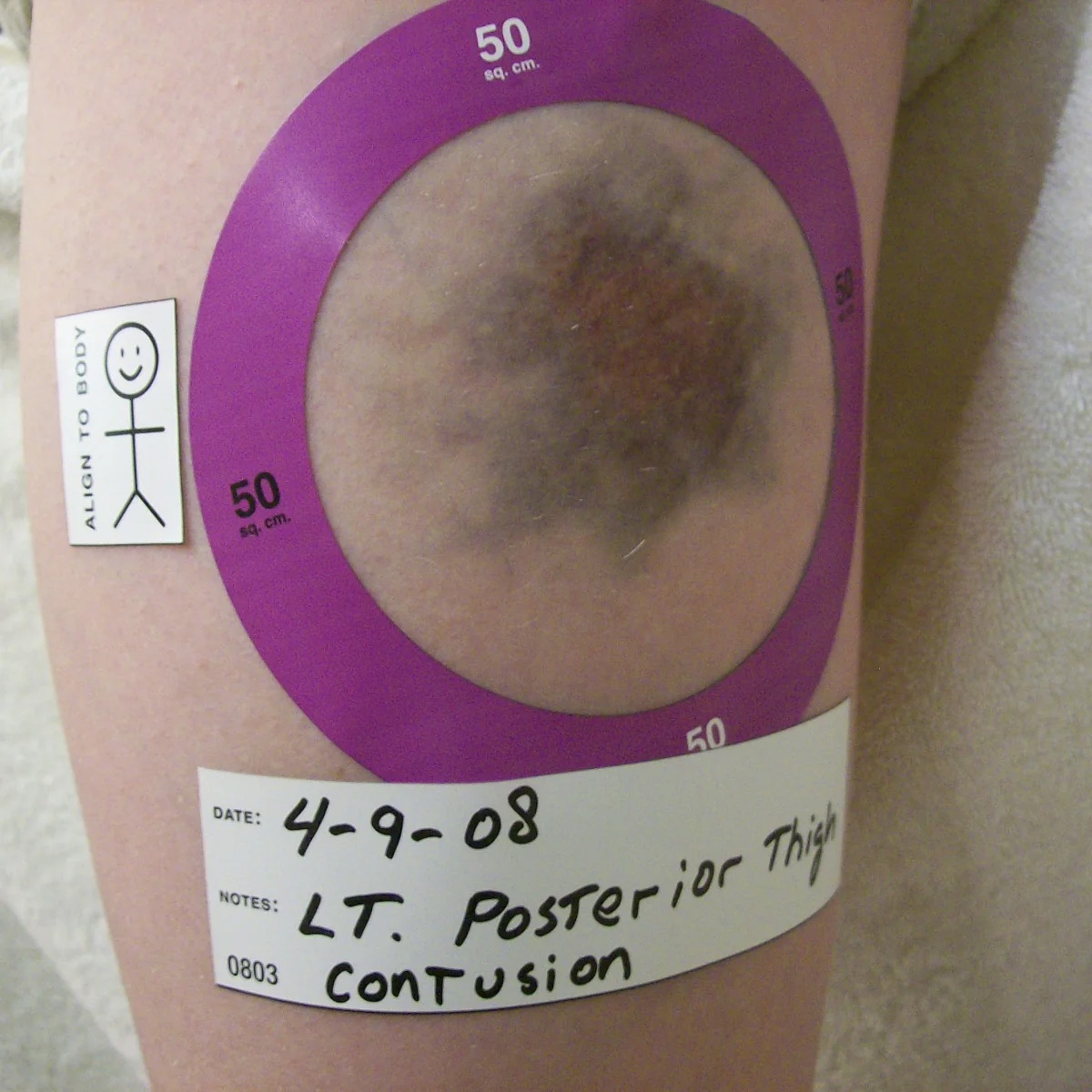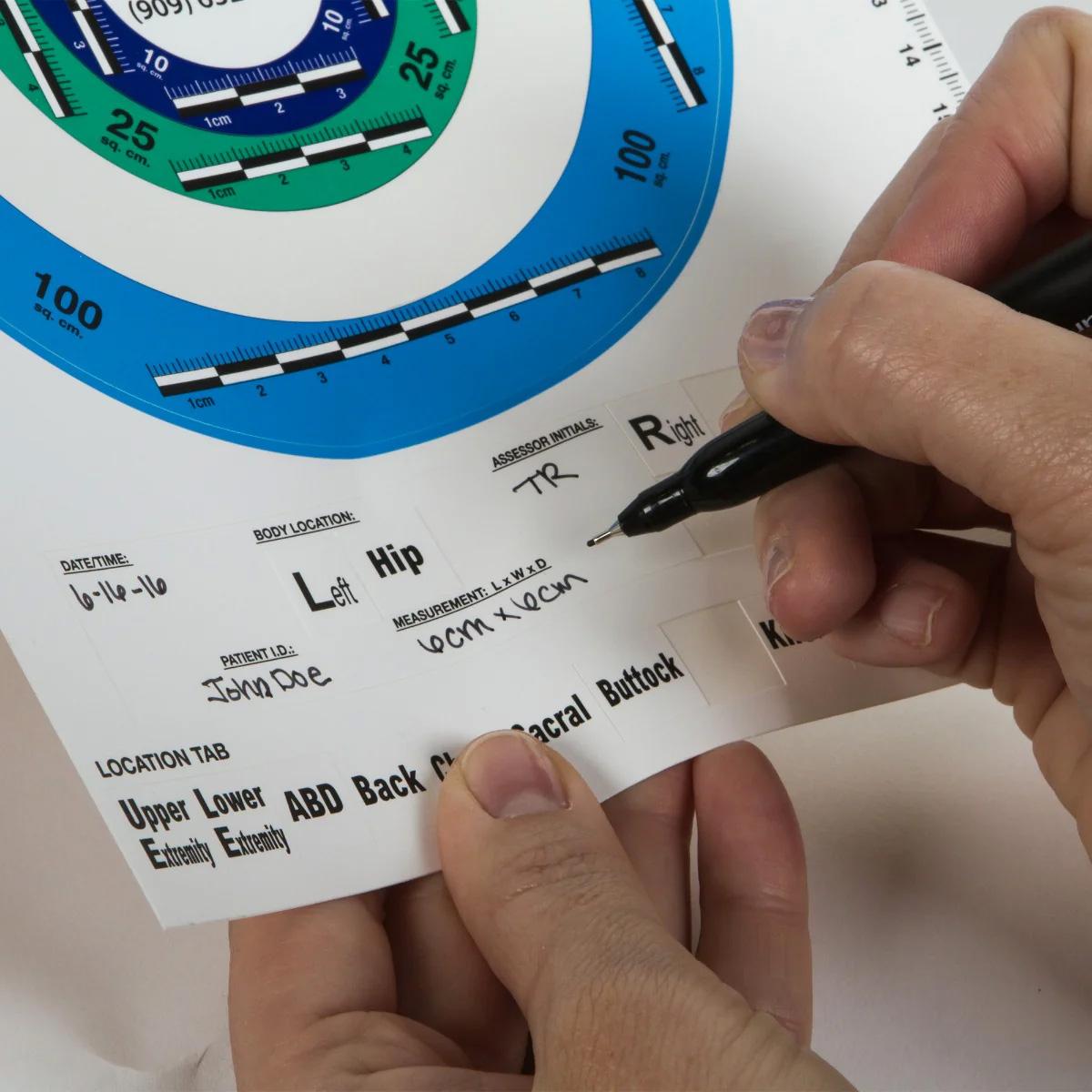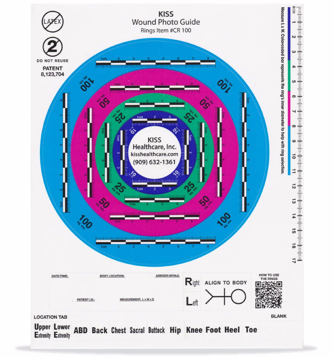 This wound Photo ScaleĀ includes 10, 25, 50, and 100 sq. cm rings, each equipped with 4 linear scales for accurate length and width measurements. KISS Wound Ring Scales come with note labels, alignment stick figure, and body location tabs, and includes two blank tabs for custom body locations.